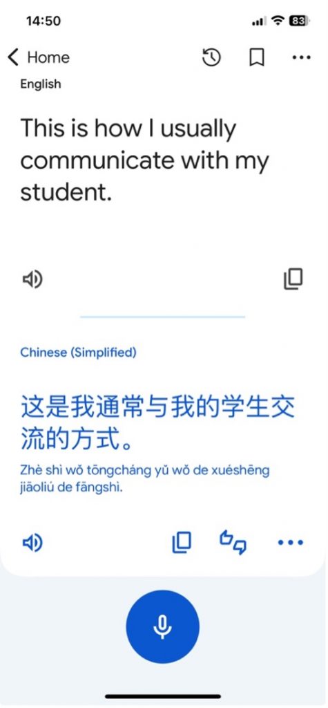 My proposal addresses a specific language barrier affecting some of our Chinese BAFA Y3 students. Over the year, my student and I tried many different strategies—first, one-on-one sessions on Teams, followed by one-on-one sessions in person. Once we developed enough access intimacy, and trust, we started using Google Translate on my phone, which allowed for a sustainable rhythm in our conversations. (Mingus, 2011) I would speak on my phone, and he would read the translated text in Chinese. He would then speak in Chinese on his phone, and I would read what he said.