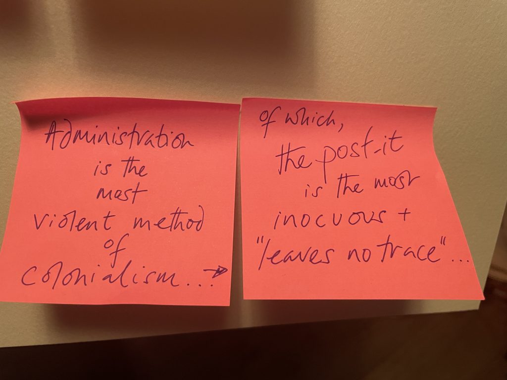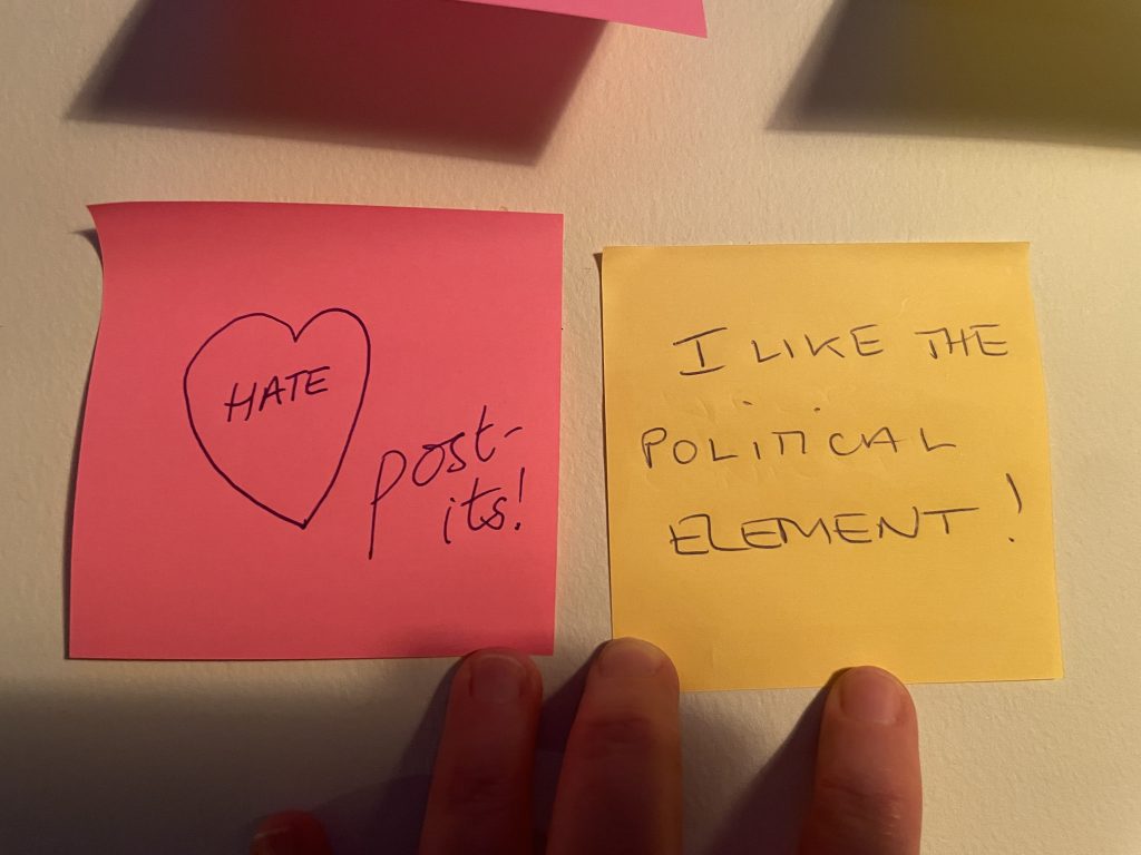 There was positive feedback on how the session used the sticky notes as an object and a method of analysis. I hadn’t thought about it that way, but it is a strategy that I will repeat. It was a successful way to bring discussions around power and politics to the table and to unveil how we are affected by structures, a dimension central to my teaching practice and my understanding of critical pedagogy. Many of my assumptions about sticky notes in pedagogy were challenged, and I’ll have to re-articulate them. Personally, that’s one of the ways I evaluate a successful teaching session if everyone, including myself, leaves with a sense of something learned or unlearned.